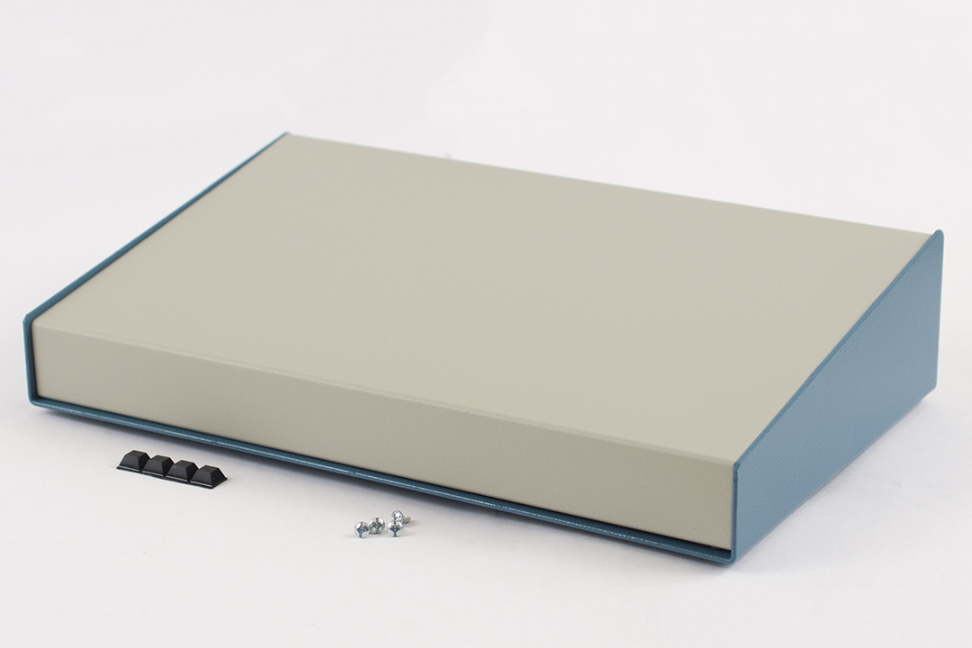 - Description: sloped metal console; 10 degree; beige top; blue case